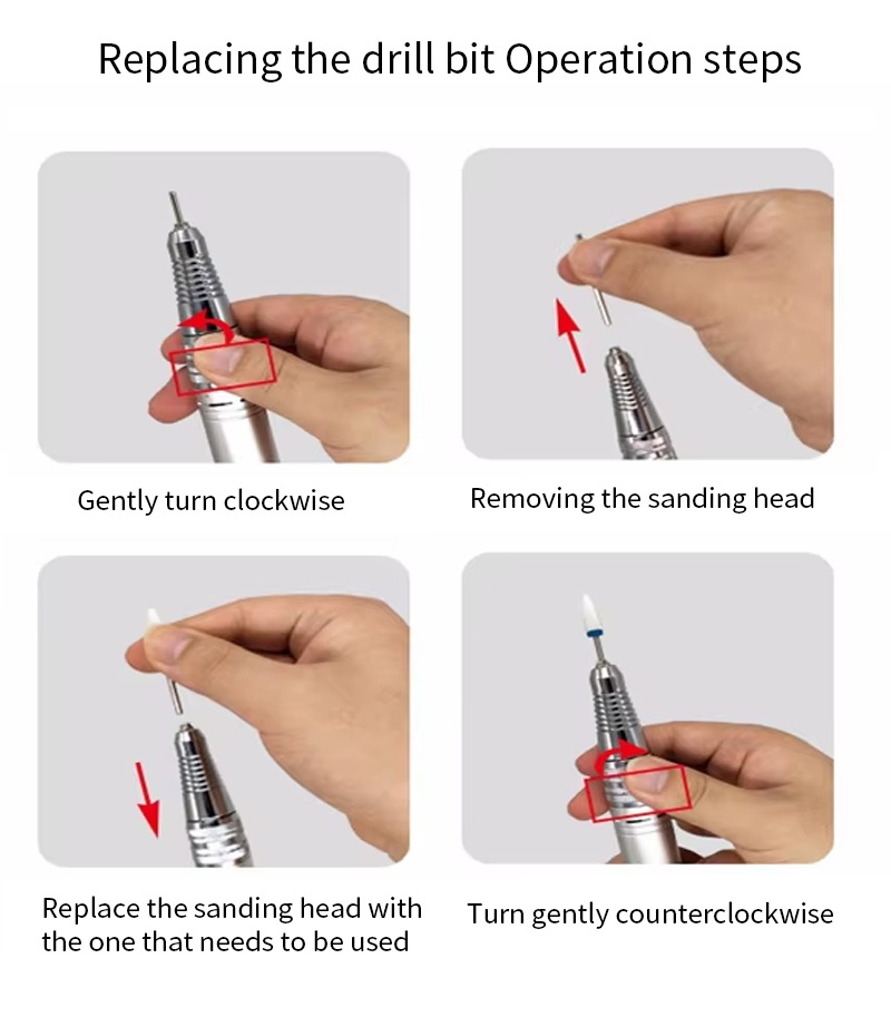 Este método de operação de broca de substituição de broca de prego elétrica de 30.000 rpm, ou seja, conectar e retirar, fácil e conveniente, a substituição pode ser usada após a conclusão.