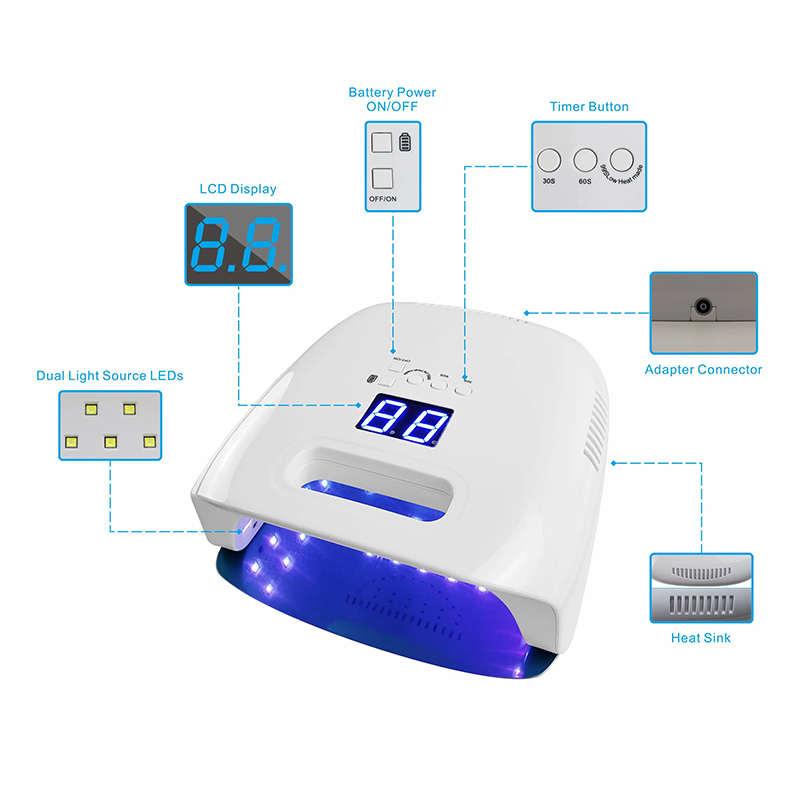 O produto tem 36 led/uv fonte de luz dupla uniformidade de distribuição de contas de lâmpada, uniformidade de cola de cozimento sem encolher cola, fonte de luz dupla cola de cozimento suave mão anti-preta, não machuca os olhos, mãos e pés podem ser usados, efeito de secagem rápida é alto.