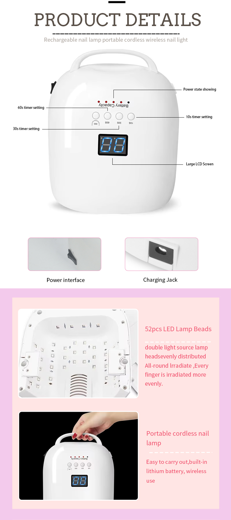 O produto garante uma secagem uniforme da cola sem encolhimento. As suas fontes de luz duplas proporcionam um aquecimento suave para evitar a descoloração das mãos e o cansaço visual, adequadas tanto para as mãos como para os pés, proporcionando resultados de secagem notavelmente rápidos.