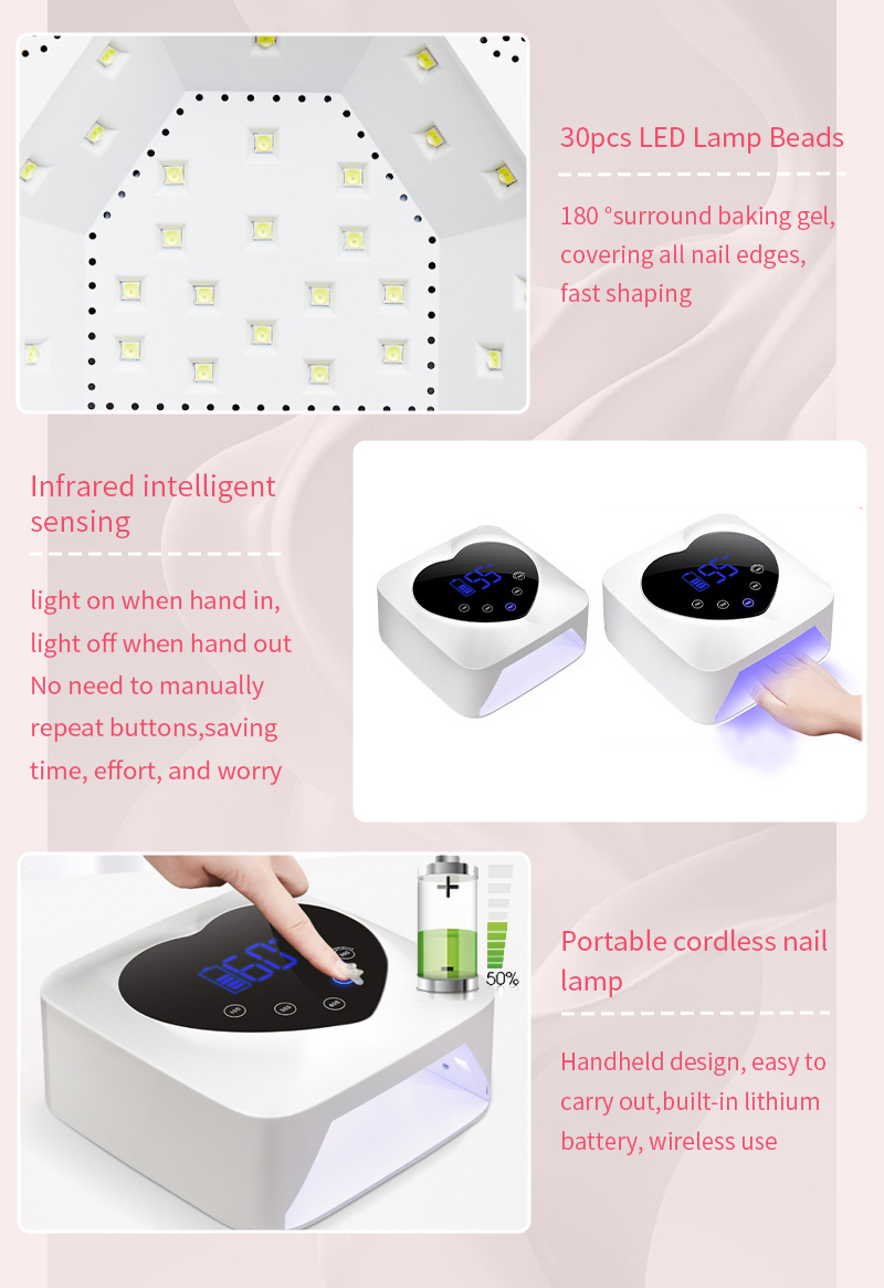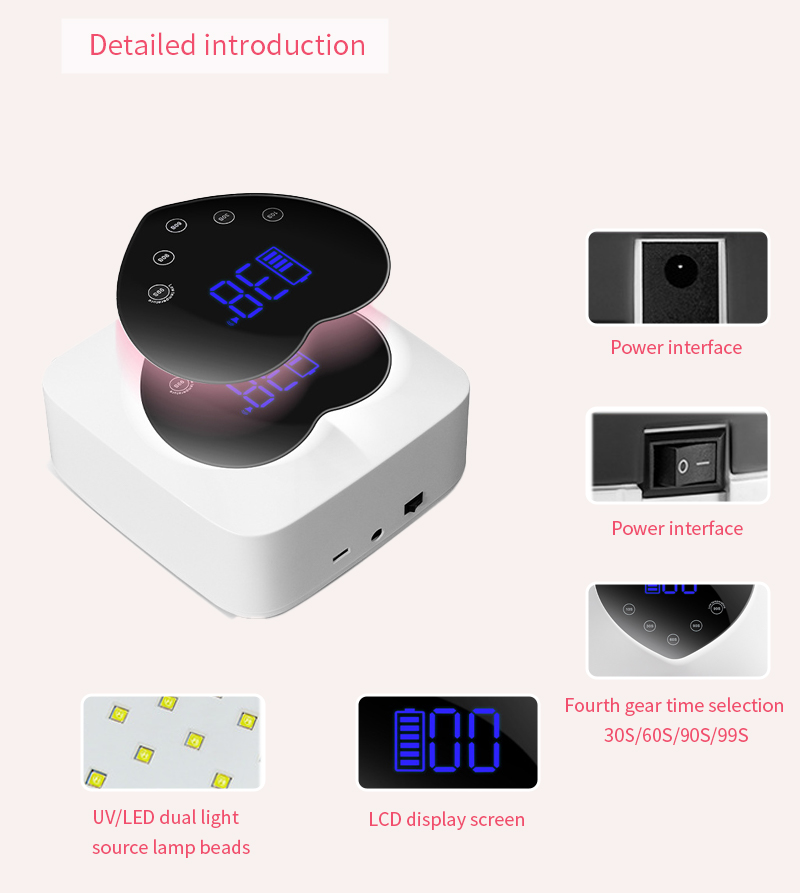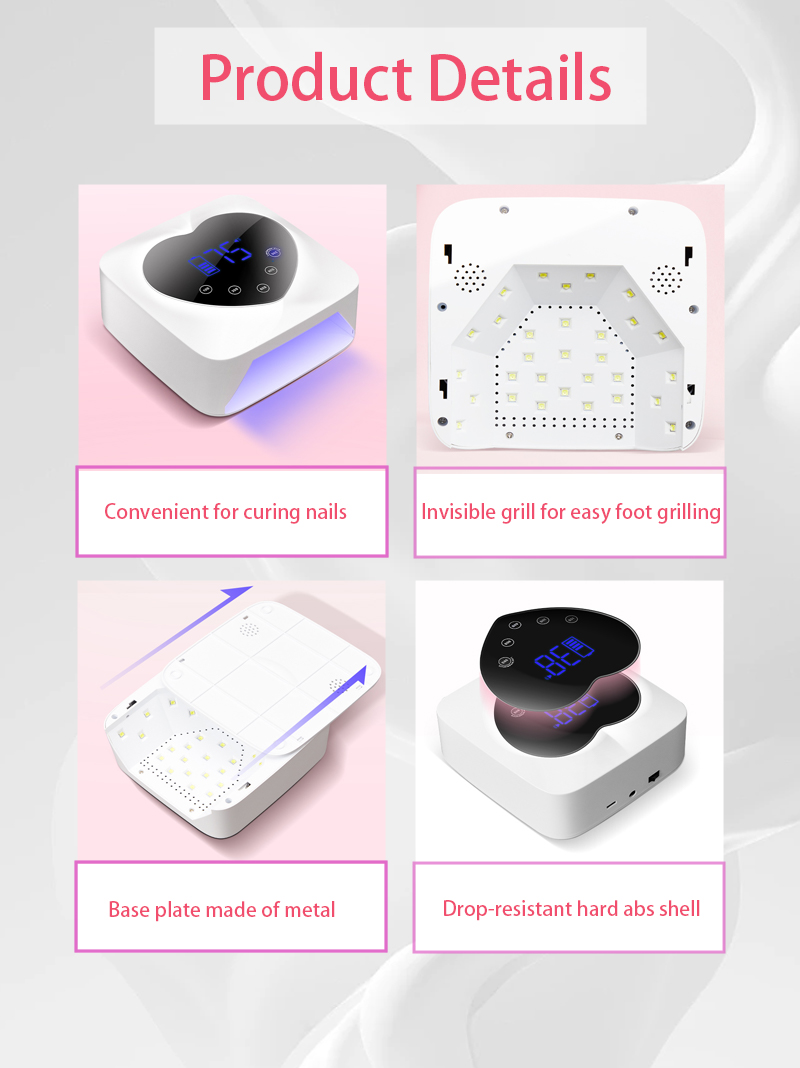 O produto garante uma secagem uniforme da cola sem encolhimento. As suas fontes de luz duplas proporcionam um aquecimento suave para evitar a descoloração das mãos e o cansaço visual, adequadas tanto para as mãos como para os pés, proporcionando resultados de secagem notavelmente rápidos.