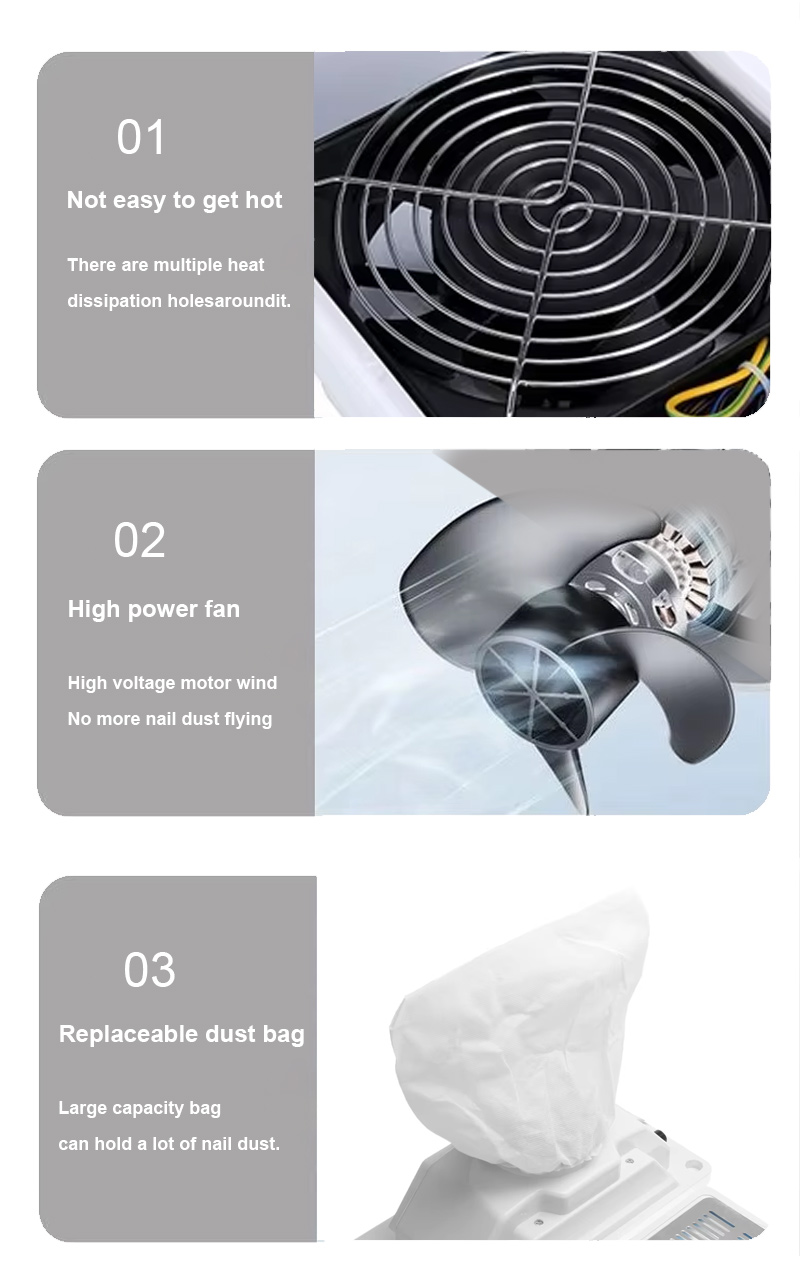 Os produtos com forte adsorção de detritos de unhas não vazam poeira, mantêm a bancada limpa e arrumada, a aspiração rápida não vaza poeira de alta potência e mais eficiente.