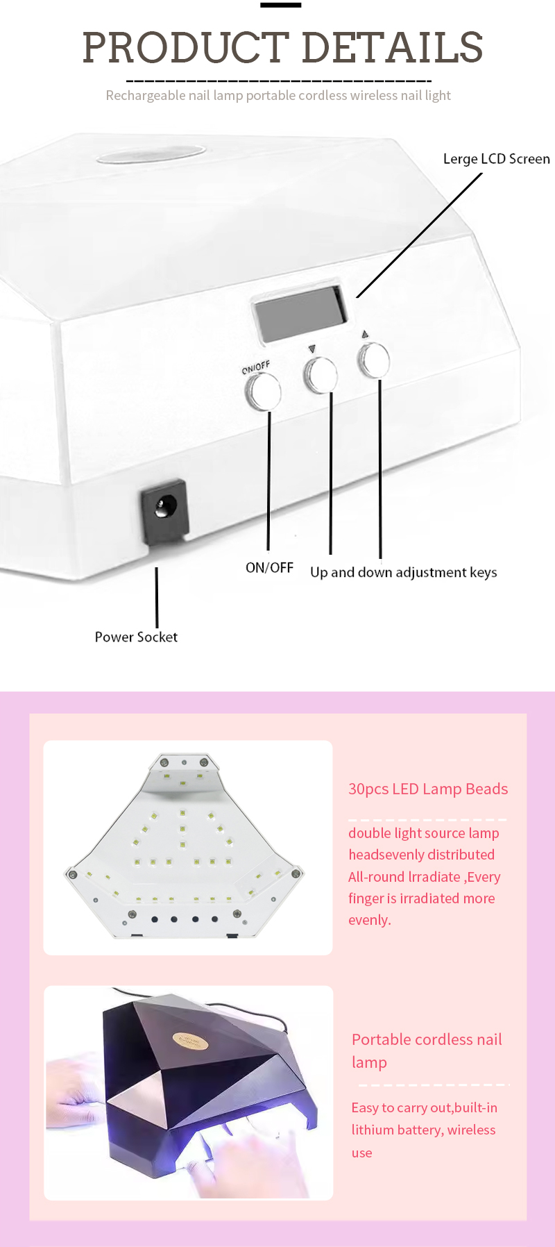 O produto garante uma secagem uniforme da cola sem encolhimento. As suas fontes de luz duplas proporcionam um aquecimento suave para evitar a descoloração das mãos e o cansaço visual, adequadas tanto para as mãos como para os pés, proporcionando resultados de secagem notavelmente rápidos.