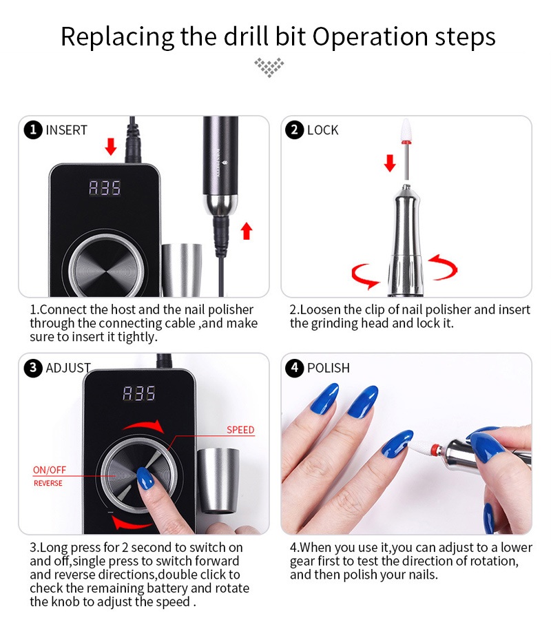 Este método de operação de broca de substituição de broca de prego elétrica esfoliante de 35.000 rpm, ou seja, conectar e retirar, fácil e conveniente, a substituição pode ser usada após a conclusão.