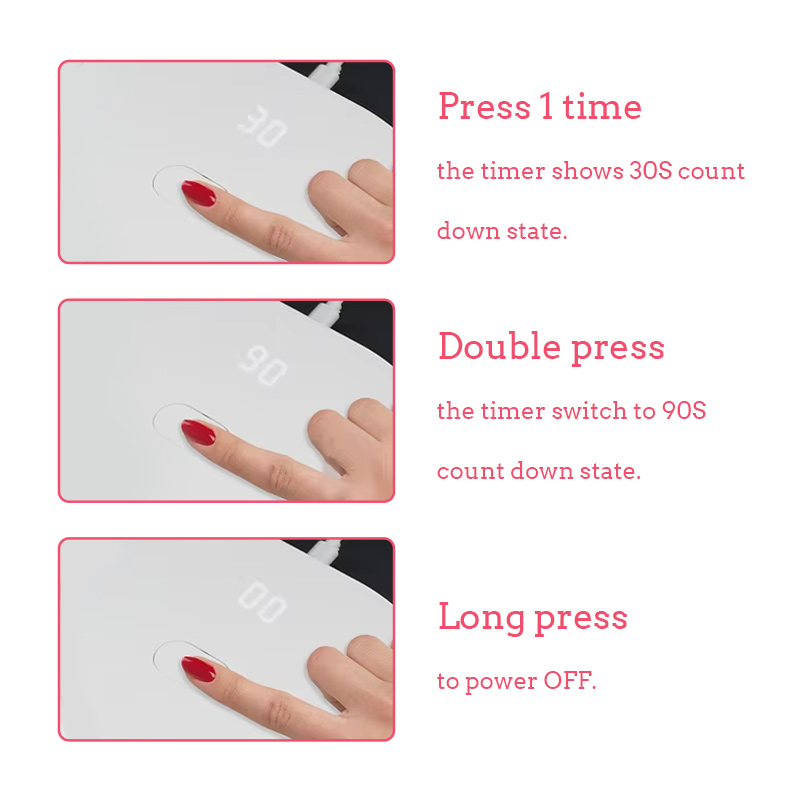 A mini lâmpada dobrável para secagem de unhas possui tecnologia de detecção inteligente infravermelha que acende automaticamente quando as mãos se aproximam e desliga quando as mãos se afastam - eliminando o incômodo de pressionar botões repetidamente e economizando tempo e esforço. A cola para cozimento de alta potência não requer muita espera, economizando tempo e esforço.