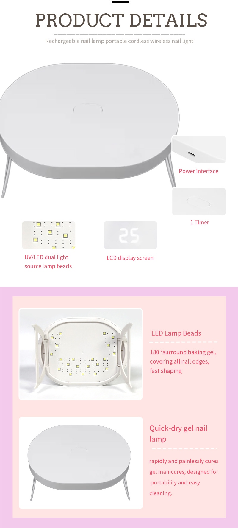 A mini lâmpada dobrável para secagem de unhas garante uma secagem uniforme da cola sem encolher. As suas fontes de luz duplas proporcionam um aquecimento suave para evitar a descoloração das mãos e o cansaço visual, adequadas tanto para as mãos como para os pés, proporcionando resultados de secagem notavelmente rápidos.