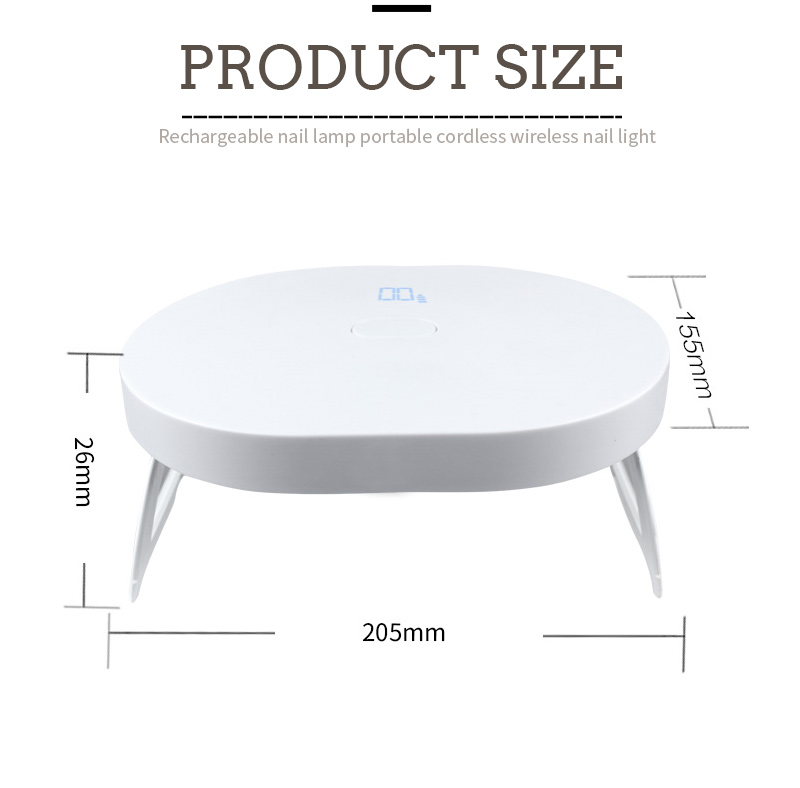 As dimensões da mini lâmpada dobrável para secar unhas são 205 mm de comprimento, 155 mm de largura e 26 mm de altura, com grande capacidade e capacidade de usar mãos e pés, o que é muito conveniente.