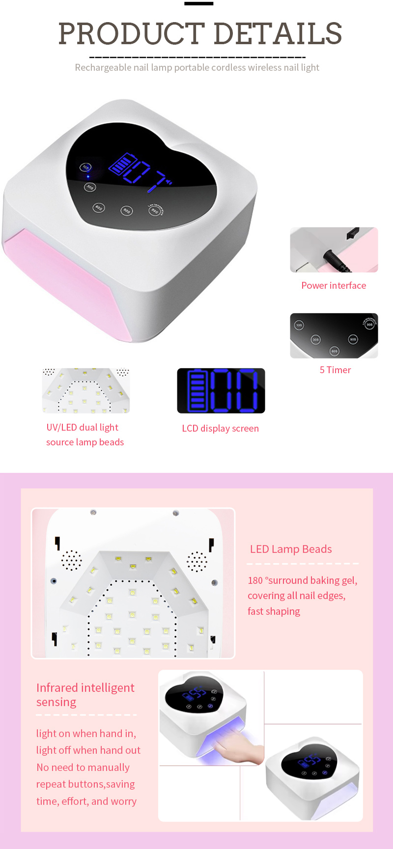 O produto garante uma secagem uniforme da cola sem encolhimento. As suas fontes de luz duplas proporcionam um aquecimento suave para evitar a descoloração das mãos e o cansaço visual, adequadas tanto para as mãos como para os pés, proporcionando resultados de secagem notavelmente rápidos.