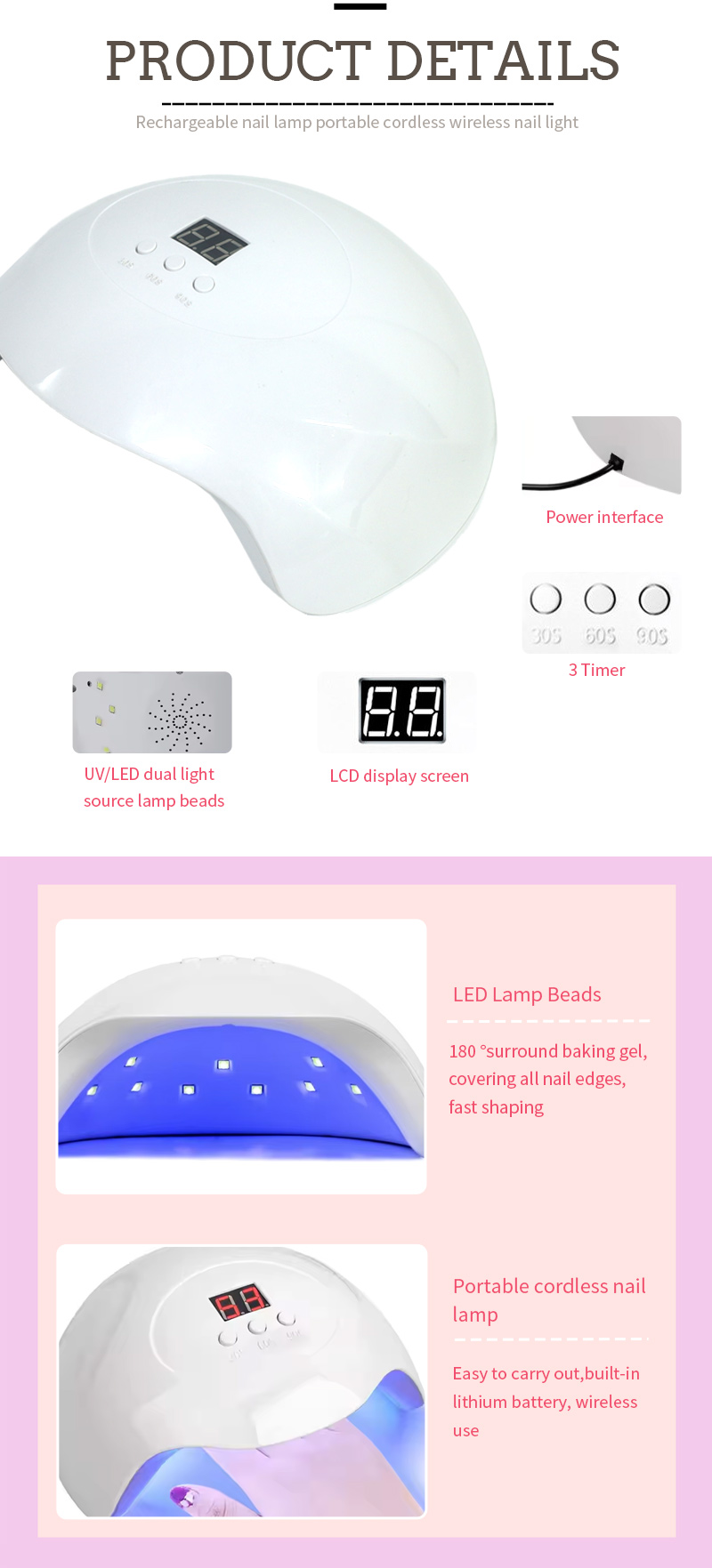 O produto garante uma secagem uniforme da cola sem encolhimento. As suas fontes de luz duplas proporcionam um aquecimento suave para evitar a descoloração das mãos e o cansaço visual, adequadas tanto para as mãos como para os pés, proporcionando resultados de secagem notavelmente rápidos.
