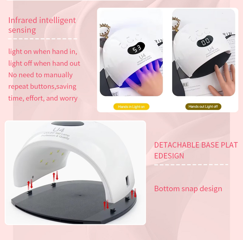 Esta lâmpada LED para secagem de unhas de alta qualidade garante uma secagem uniforme da cola sem encolhimento. As suas fontes de luz duplas proporcionam um aquecimento suave para evitar a descoloração das mãos e o cansaço visual, adequadas tanto para as mãos como para os pés, proporcionando resultados de secagem notavelmente rápidos.