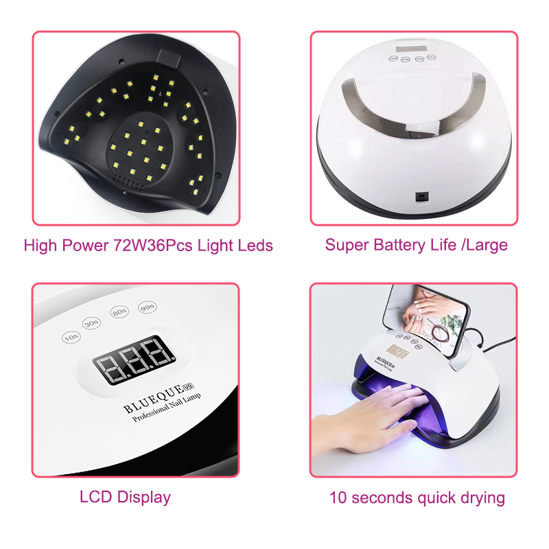 A lâmpada de unhas de alta qualidade com função de temporizador garante uma secagem uniforme da cola sem encolhimento. As suas fontes de luz duplas proporcionam um aquecimento suave para evitar a descoloração das mãos e o cansaço visual, adequadas tanto para as mãos como para os pés, proporcionando resultados de secagem notavelmente rápidos.