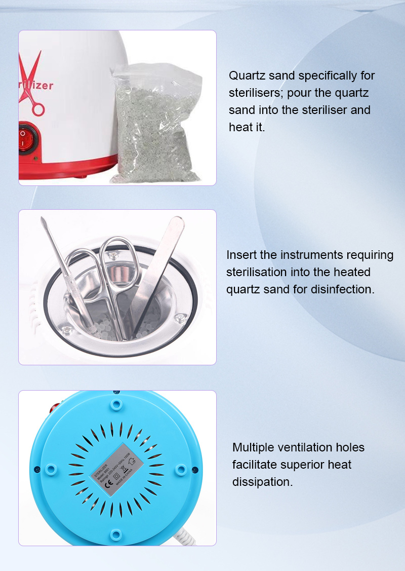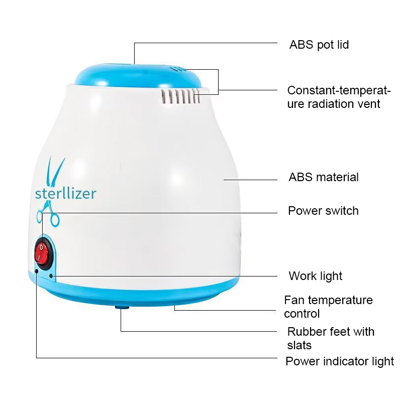 Este esterilizador gera calor principalmente através de um anel de aquecimento, utilizando altas temperaturas para desinfecção.