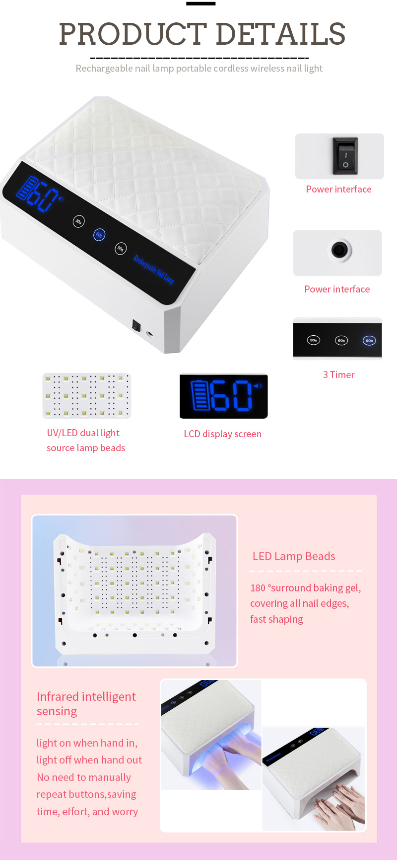 O produto garante uma secagem uniforme da cola sem encolhimento. As suas fontes de luz duplas proporcionam um aquecimento suave para evitar a descoloração das mãos e o cansaço visual, adequadas tanto para as mãos como para os pés, proporcionando resultados de secagem notavelmente rápidos.