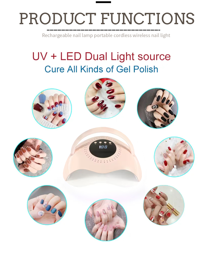 O produto garante uma secagem uniforme da cola sem encolhimento. As suas fontes de luz duplas proporcionam um aquecimento suave para evitar a descoloração das mãos e o cansaço visual, adequadas tanto para as mãos como para os pés, proporcionando resultados de secagem notavelmente rápidos.