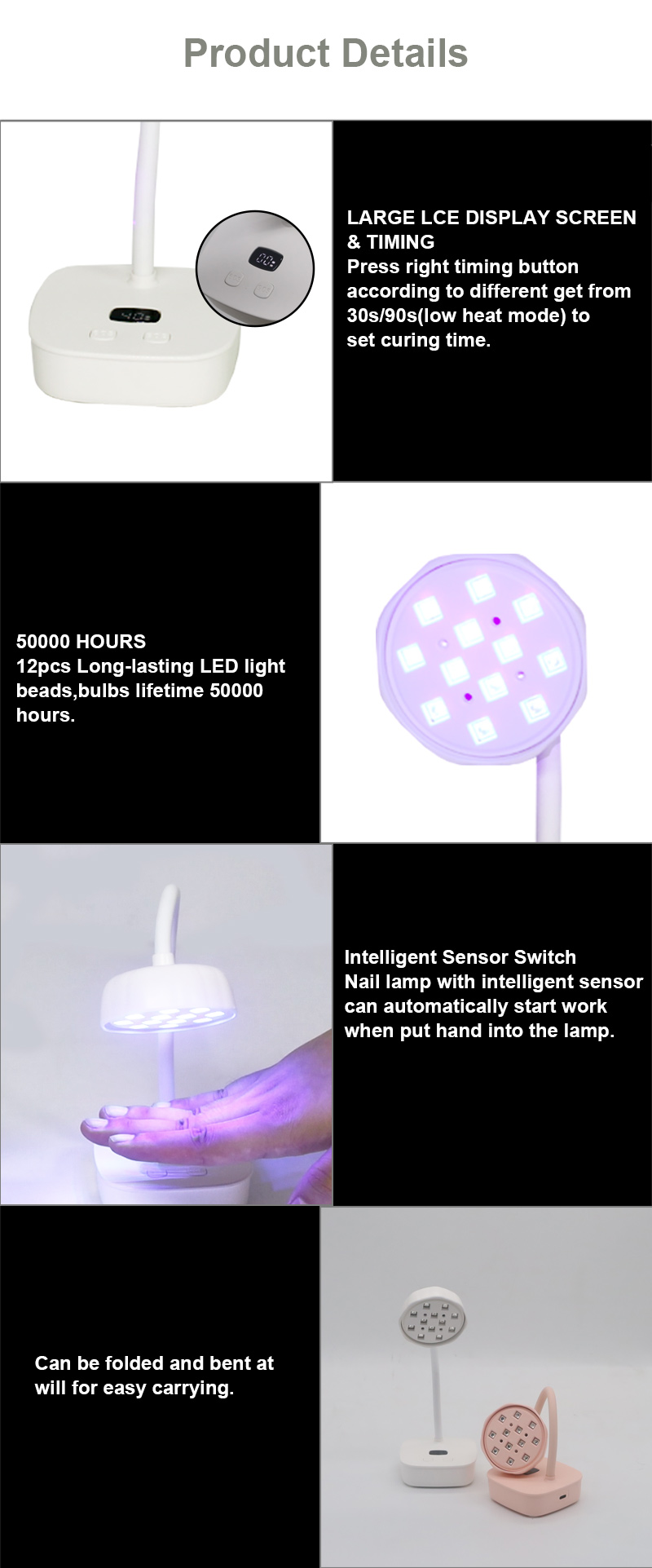 O produto garante uma secagem uniforme da cola sem encolhimento. As suas fontes de luz duplas proporcionam um aquecimento suave para evitar a descoloração das mãos e o cansaço visual, adequadas tanto para as mãos como para os pés, proporcionando resultados de secagem notavelmente rápidos.
