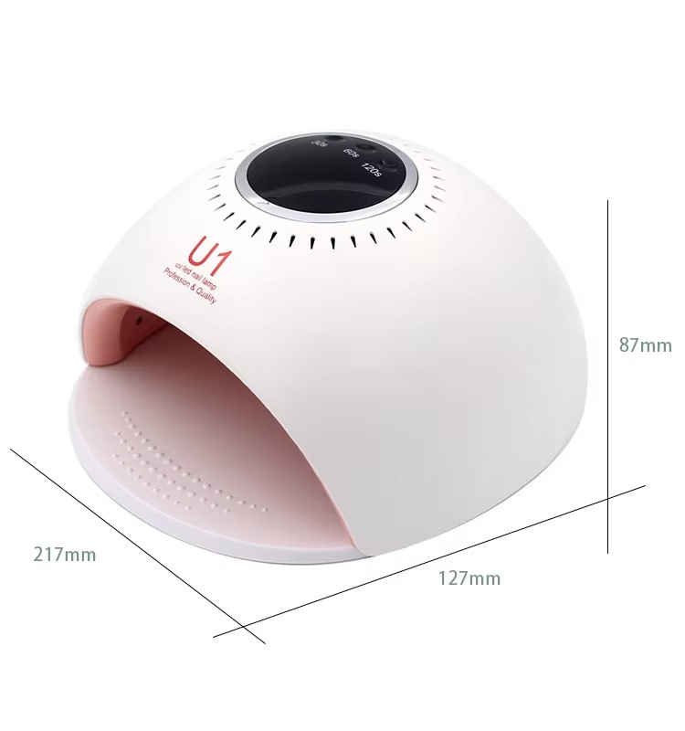 O tamanho recarregável do produto de 60w da luz de unhas é de 215 mm de comprimento, 245 mm de largura e 115 mm de altura. O tamanho é perfeito para mãos e pés, leve e fácil de transportar, perfeito para uso profissional de salão de beleza.