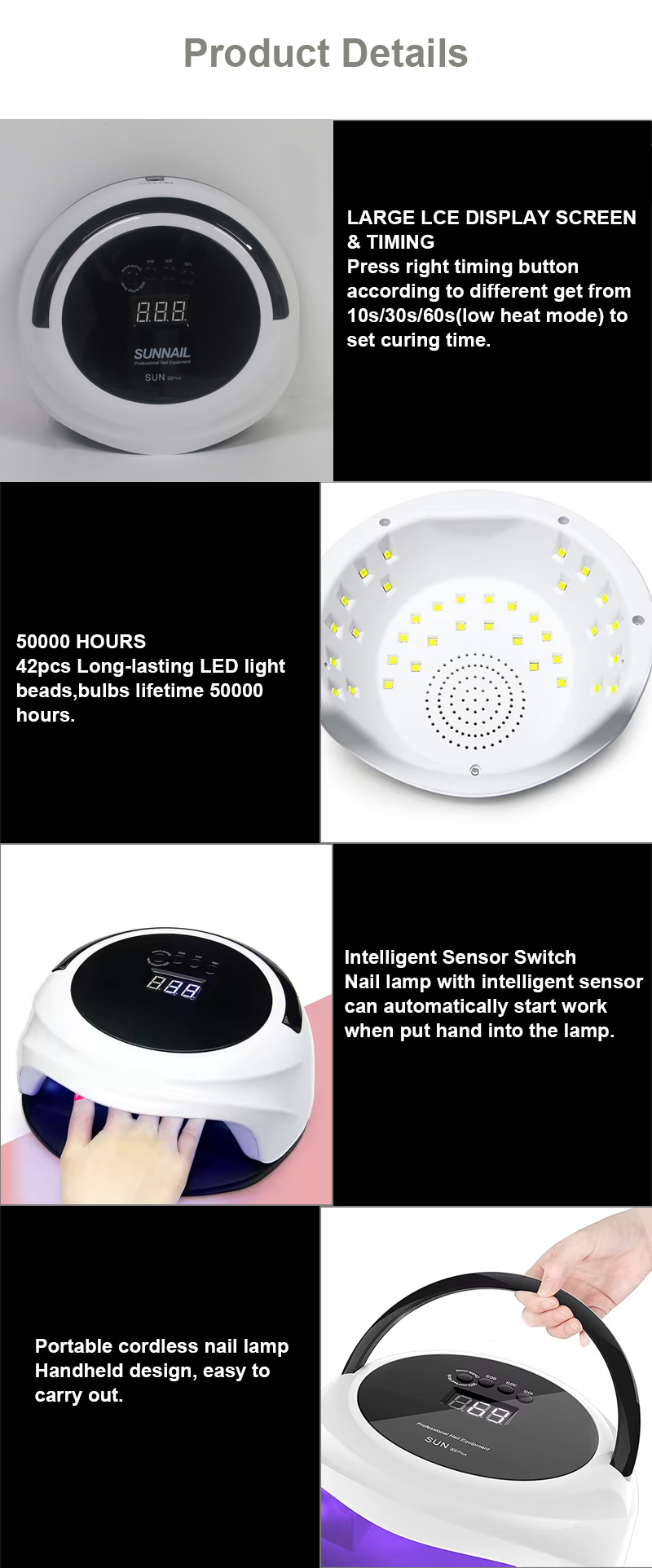 A lâmpada para secar unhas com função de sensor automático possui tecnologia de detecção inteligente infravermelha que acende automaticamente quando as mãos se aproximam e desliga quando as mãos se afastam - eliminando o incômodo de pressionar botões repetidamente e economizando tempo e esforço. A cola para cozimento de alta potência não requer muita espera, economizando tempo e esforço.