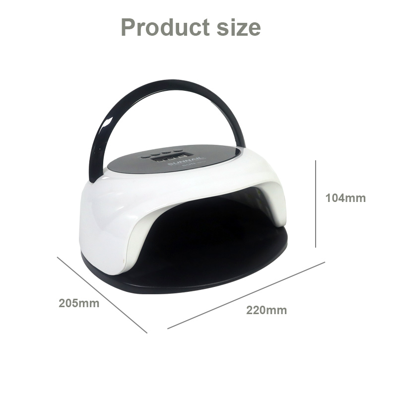 As dimensões da lâmpada para secar unhas com função de sensor automático são 205 mm de comprimento, 220 mm de largura e 104 mm de altura, com grande capacidade e capacidade de usar mãos e pés, o que é muito conveniente.