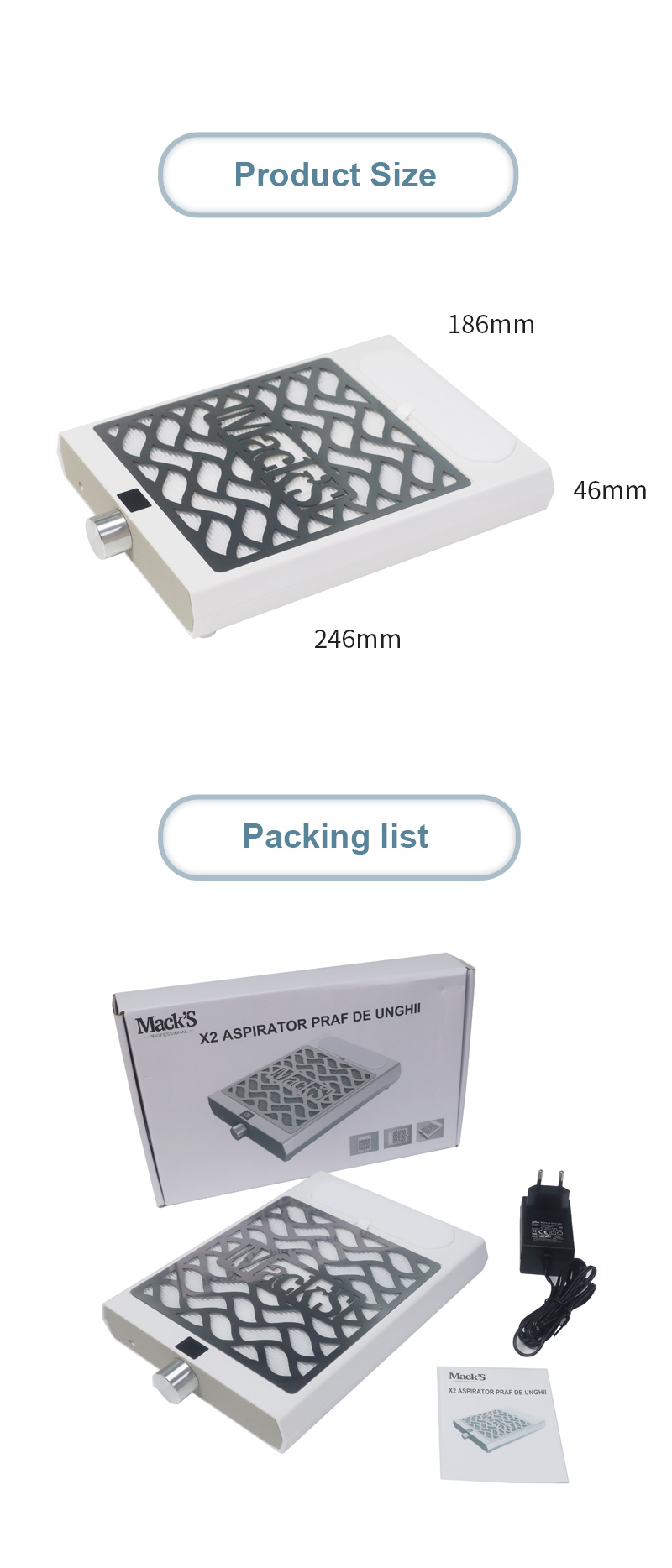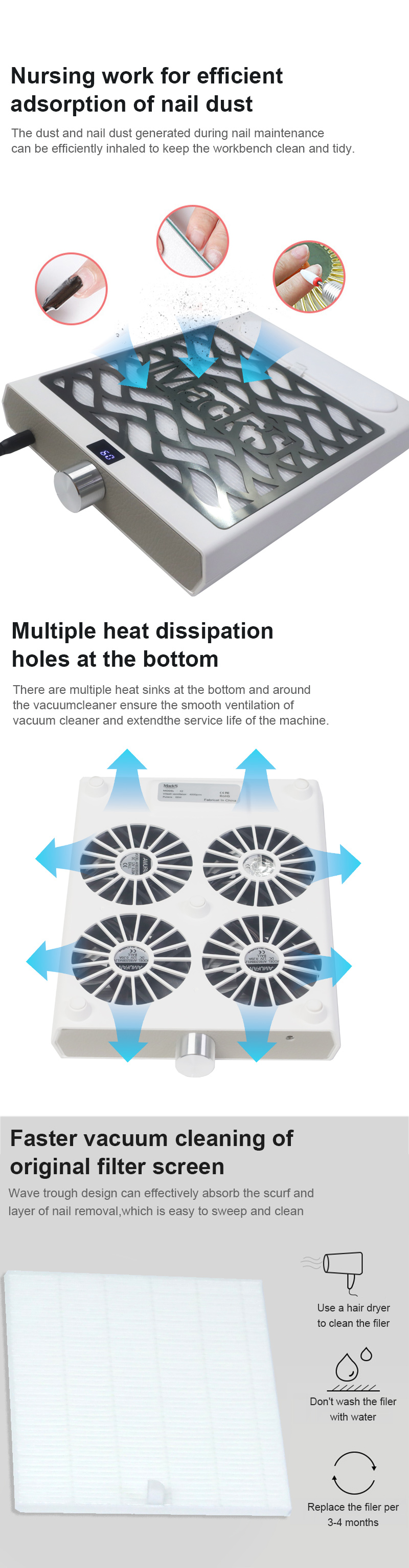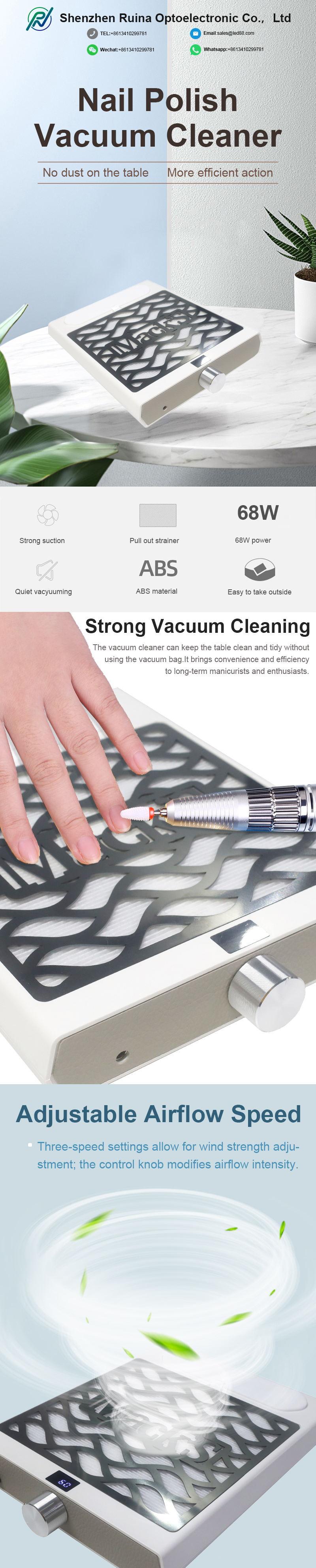 Produtos com forte adsorção de detritos de unhas não vazam poeira, mantêm a bancada limpa e arrumada, a aspiração rápida não vaza poeira de alta potência mais eficiente.