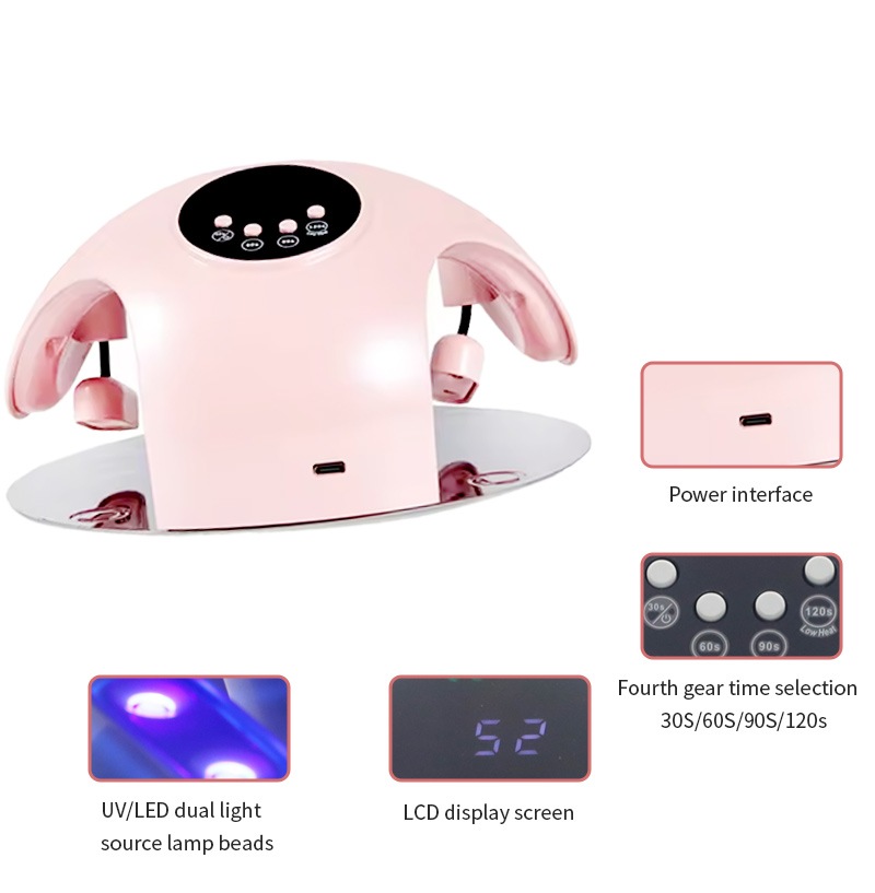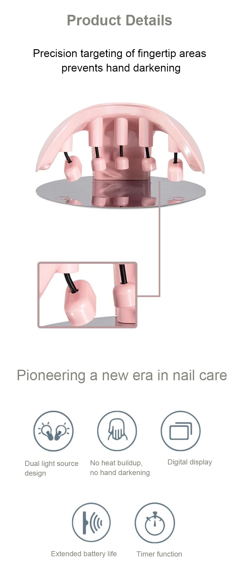 O produto garante uma secagem uniforme da cola sem encolhimento. As suas fontes de luz duplas proporcionam um aquecimento suave para evitar a descoloração das mãos e o cansaço visual, adequadas tanto para as mãos como para os pés, proporcionando resultados de secagem notavelmente rápidos.