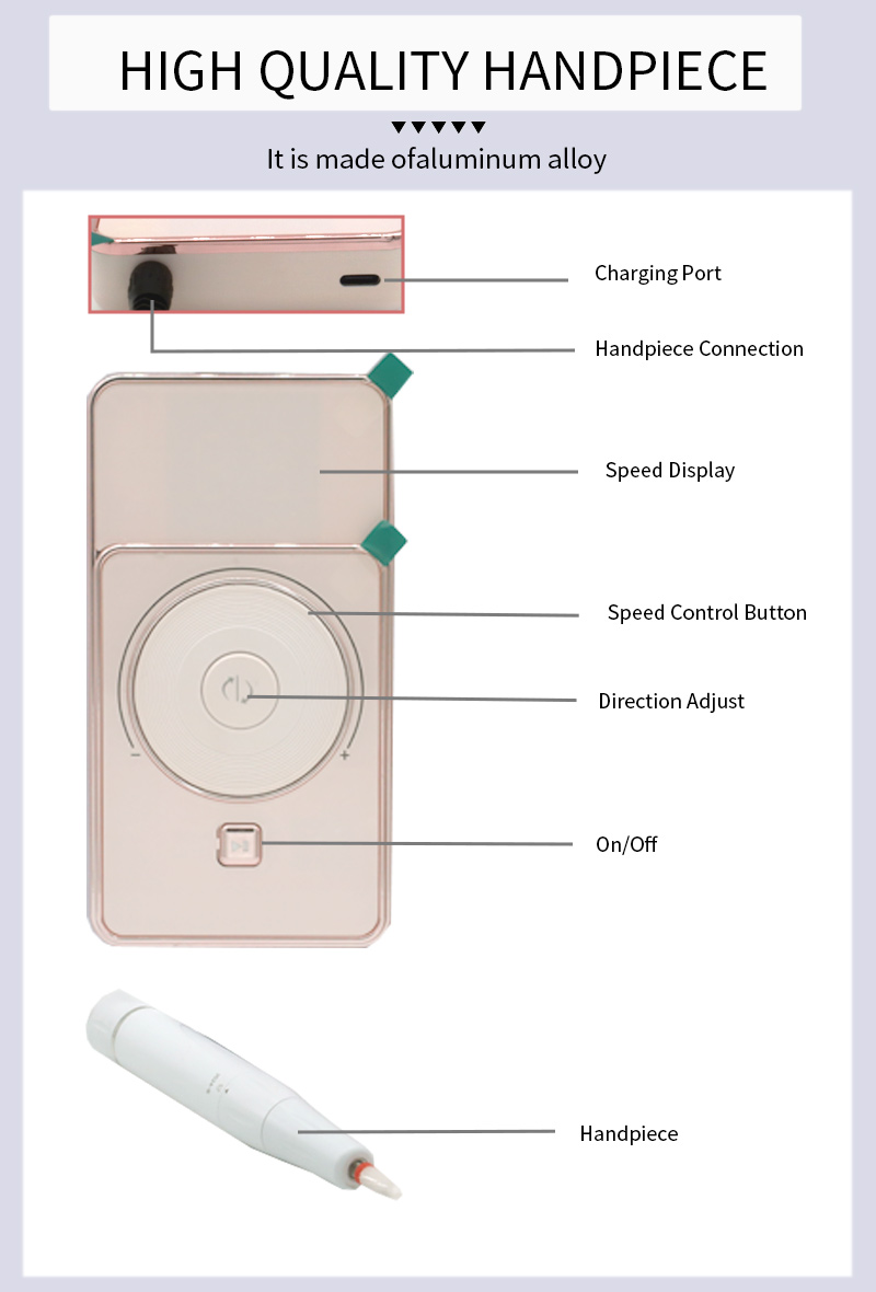 Este design de tela de caneta de moagem de alta velocidade e baixo ruído, com soquete de caneta de lixa, tela de cristal líquido LCD pode mostrar o número de rotações / potência / direção, botão de mudança de velocidade, botão de alternância no sentido horário / anti-horário, botão de pausa, motor profissional de 30.000 rpm, cabeça de moagem com travamento aparafusada.