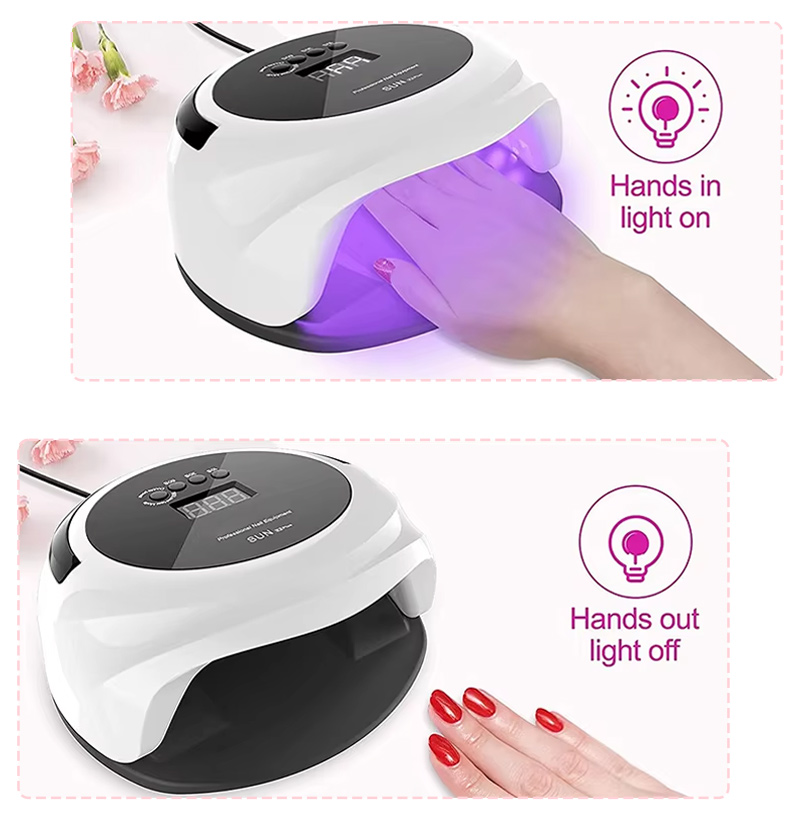 O produto garante uma secagem uniforme da cola sem encolhimento. As suas fontes de luz duplas proporcionam um aquecimento suave para evitar a descoloração das mãos e o cansaço visual, adequadas tanto para as mãos como para os pés, proporcionando resultados de secagem notavelmente rápidos.