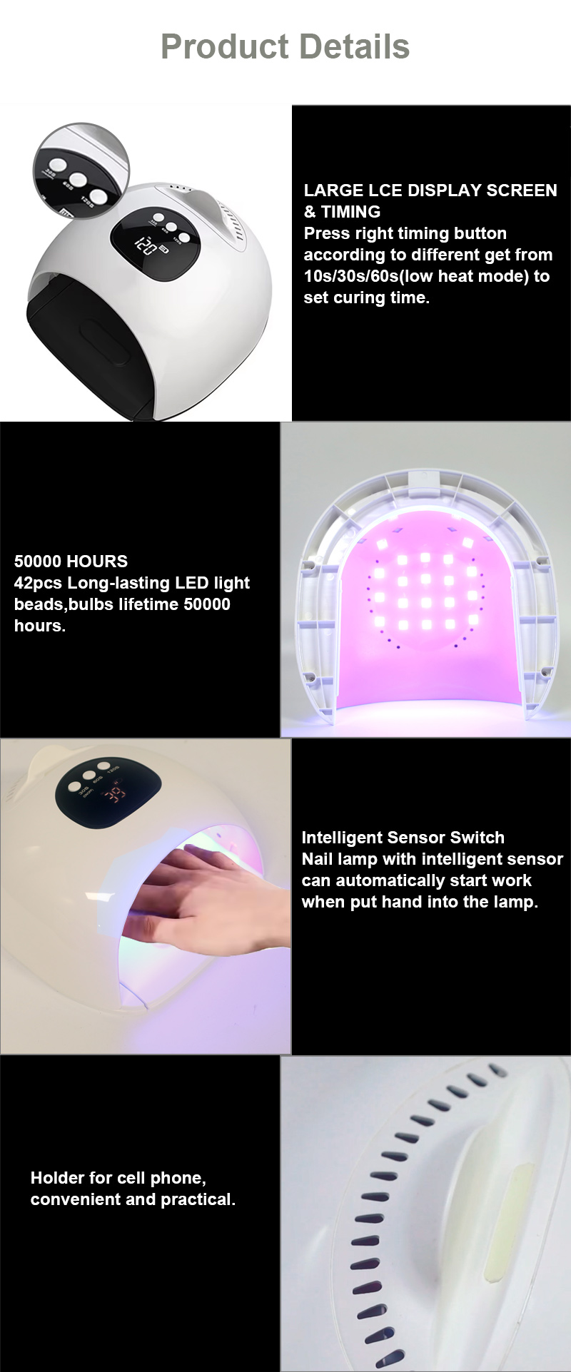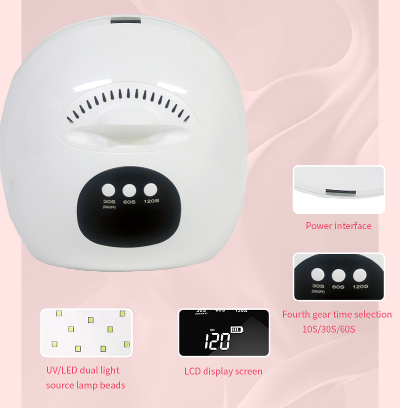 O produto garante uma secagem uniforme da cola sem encolhimento. As suas fontes de luz duplas proporcionam um aquecimento suave para evitar a descoloração das mãos e o cansaço visual, adequadas tanto para as mãos como para os pés, proporcionando resultados de secagem notavelmente rápidos.