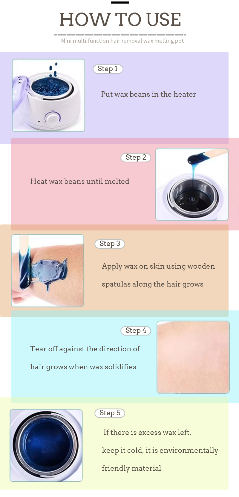 Método de operação de cera depilatória do produto, quanto maior a temperatura, mais rápido a cera derrete, quanto mais baixa a temperatura, mais lentamente a cera derrete, primeiro despeje na quantidade apropriada de grãos de cera depilatórios, aquecendo até que os grãos de cera derretam, depois as partes depilatórias da cera depilatória uniformemente revestida e, finalmente, contra a direção do crescimento do cabelo, arrancando.