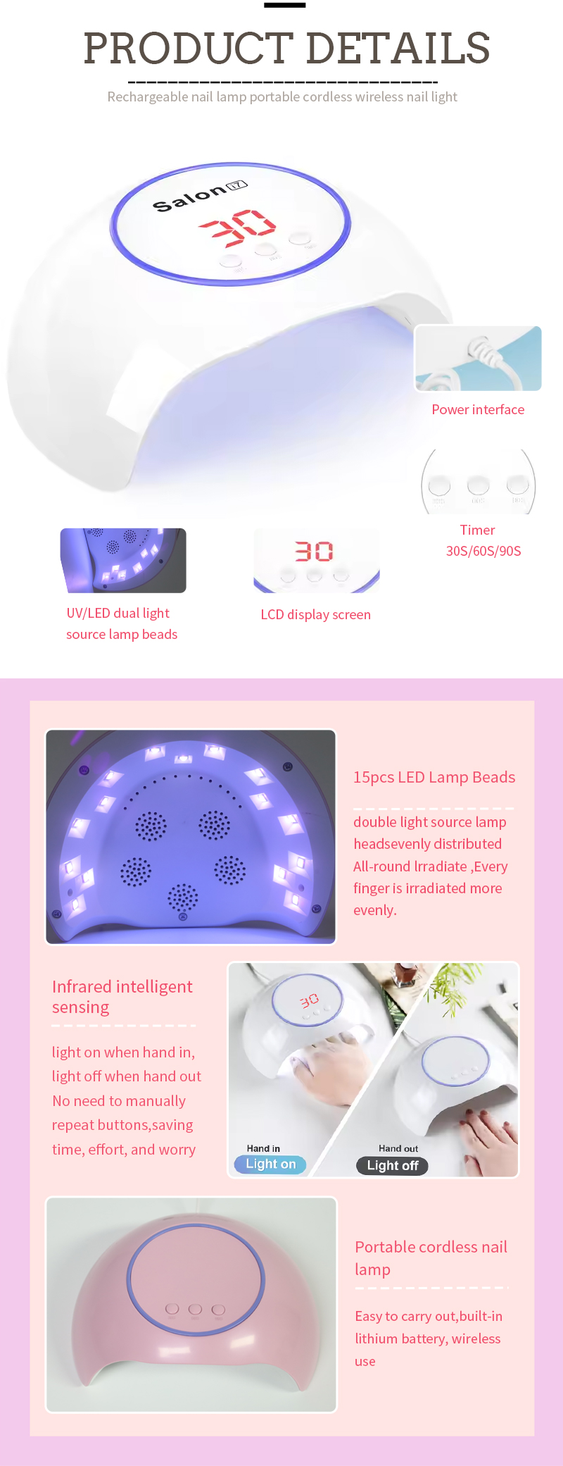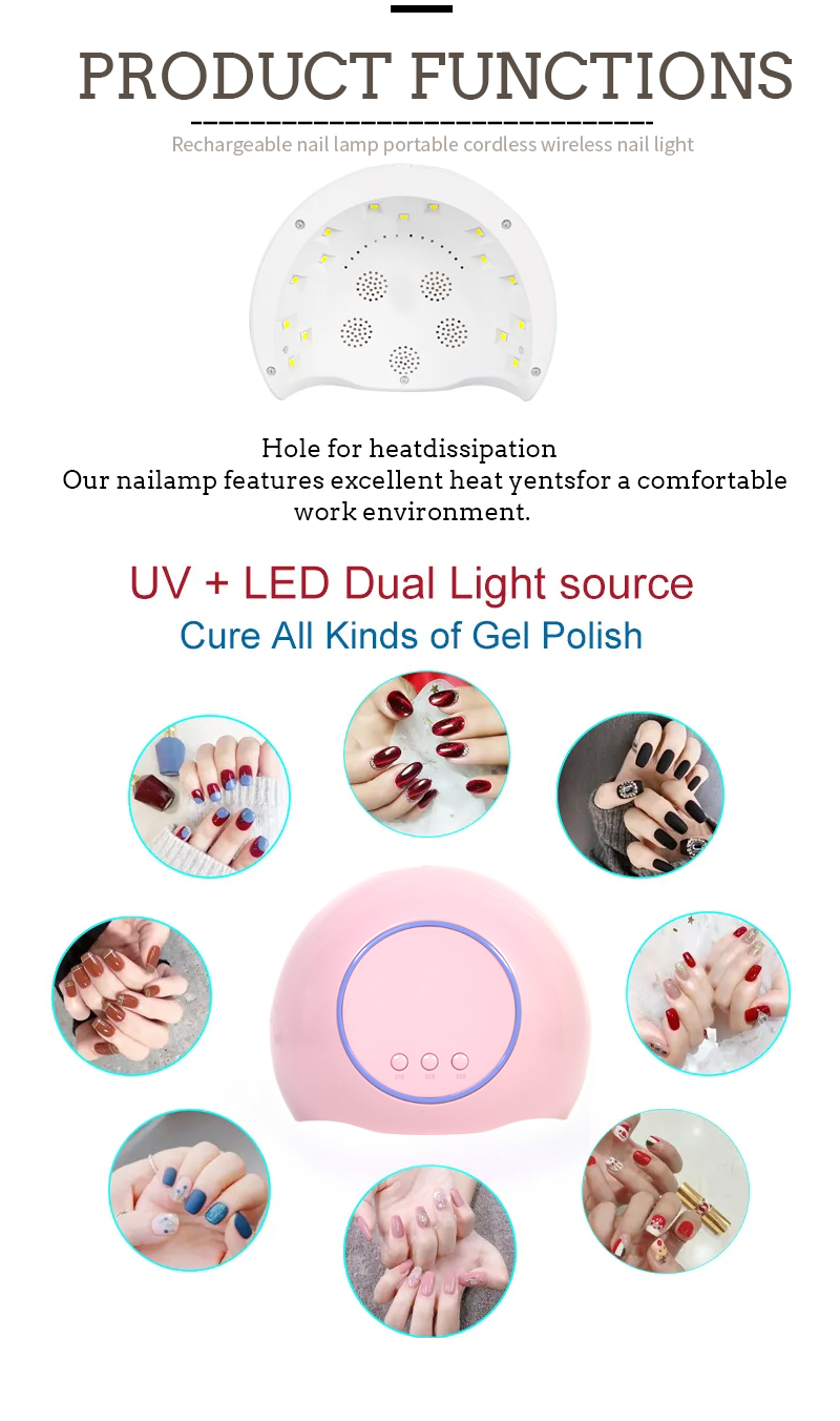 O produto garante uma secagem uniforme da cola sem encolhimento. As suas fontes de luz duplas proporcionam um aquecimento suave para evitar a descoloração das mãos e o cansaço visual, adequadas tanto para as mãos como para os pés, proporcionando resultados de secagem notavelmente rápidos.