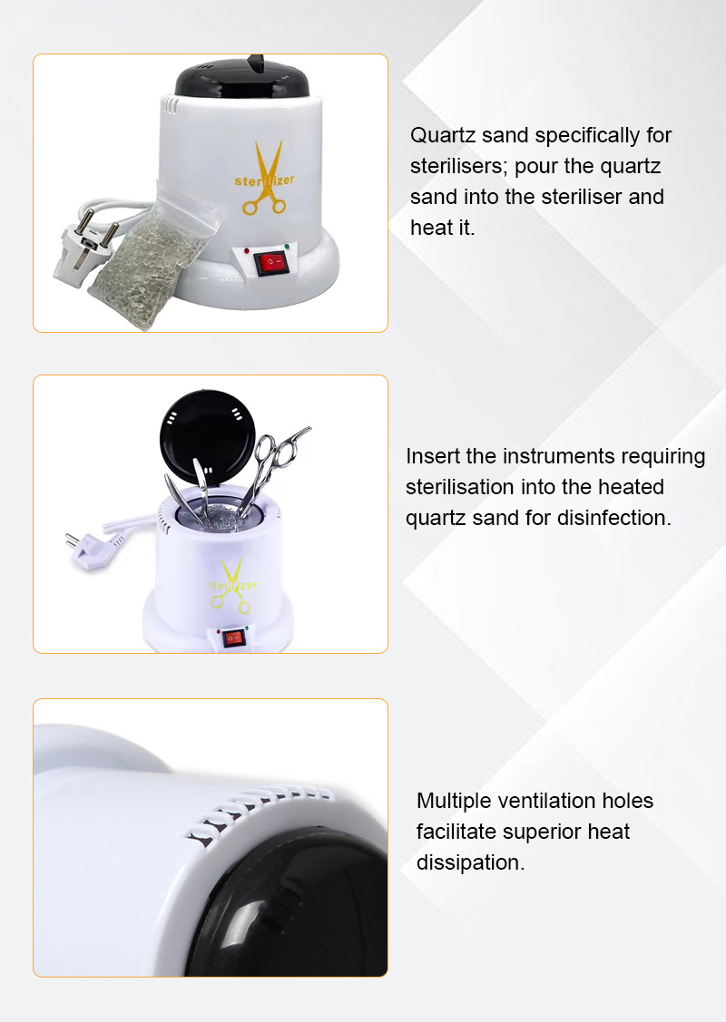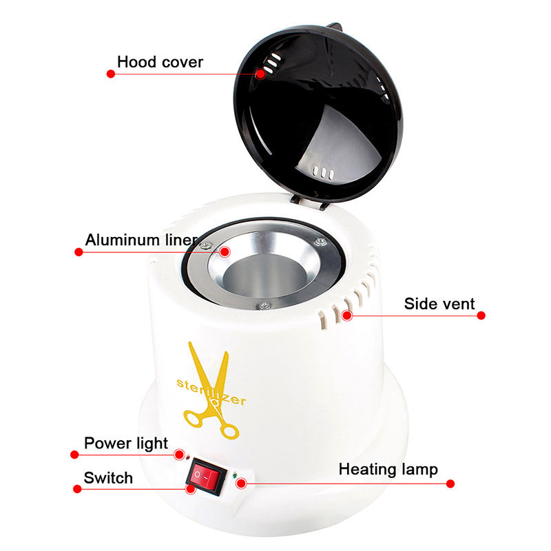 Este esterilizador gera calor principalmente através de um anel de aquecimento, utilizando altas temperaturas para desinfecção.