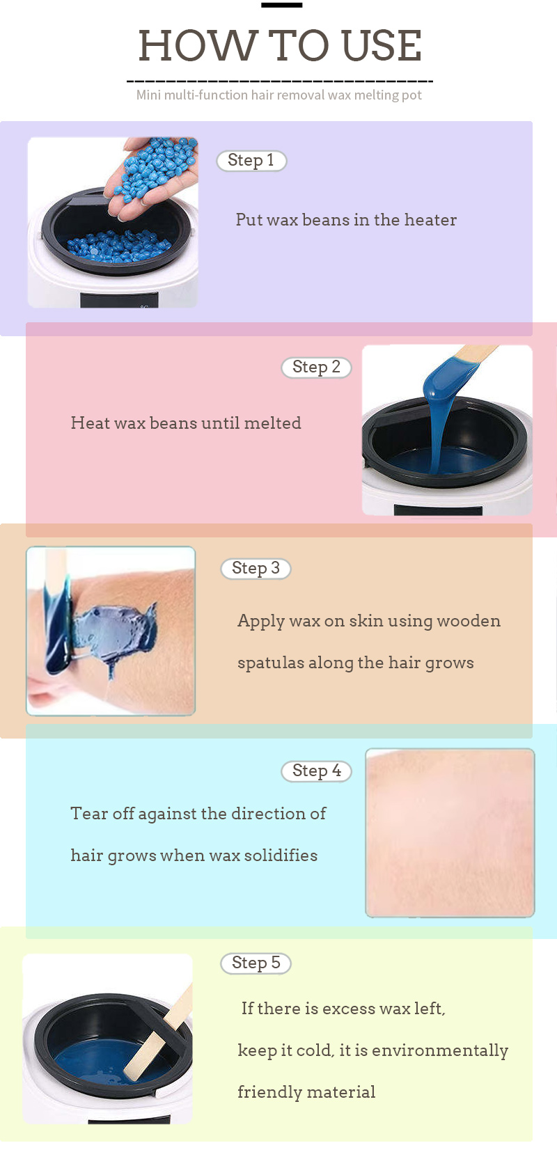 Método de operação de cera depilatória do produto, quanto maior a temperatura, mais rápido a cera derrete, quanto mais baixa a temperatura, mais lentamente a cera derrete, primeiro despeje na quantidade apropriada de grãos de cera depilatórios, aquecendo até que os grãos de cera derretam, depois as partes depilatórias da cera depilatória uniformemente revestida e, finalmente, contra a direção do crescimento do cabelo, arrancando.